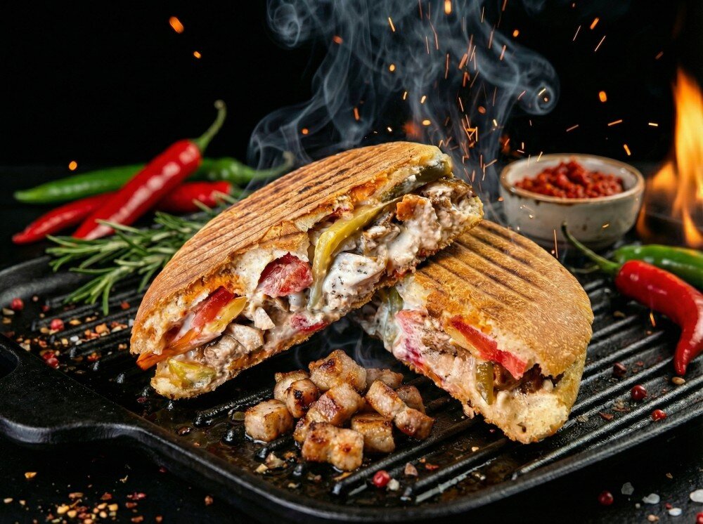 Гиро, мясо куриное, огурец соленый, картофель фри, помидор, соус