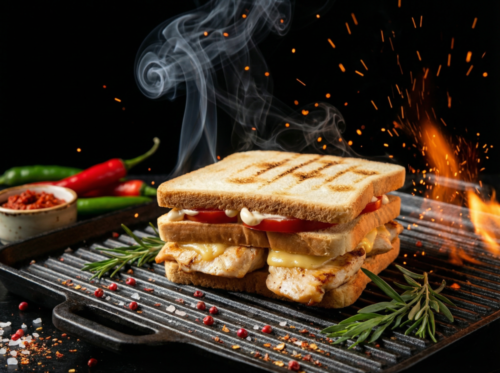 Хлеб «Харрис», соус фирменный, куриная отбивная, листья салата, соленый огурец, помидор, сыр чеддер