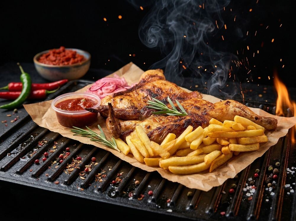 В блюдо входит только цыпленок на мангале, но так же Вы можете дополнительно добавить картофель фри и шашлычный соус